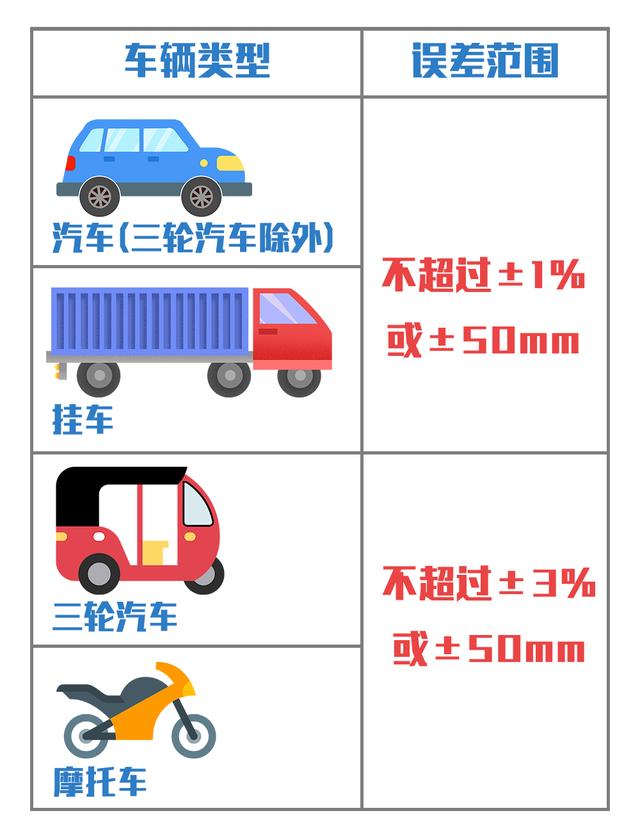 注冊登記安全檢驗(yàn)時(shí),機(jī)動(dòng)車外廓尺寸實(shí)測值不應(yīng)超出GB7258、GB1589規(guī)定的限值,且與機(jī)動(dòng)車產(chǎn)品公告,機(jī)動(dòng)車出廠合格證記載的數(shù)值相比,誤差應(yīng)滿足:
